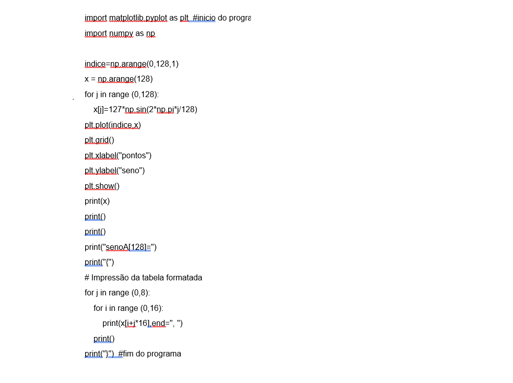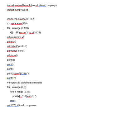 Com a linguagem Python, é possível criar uma tabela de lookup para um sinal senoidal utilizando funções matemáticas simples. Abaixo, apresentamos um exemplo de código que gera uma tabela com 256 valores, representando um ciclo completo de uma onda senoidal.