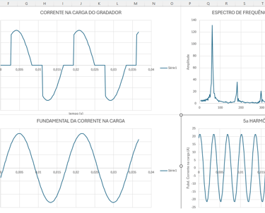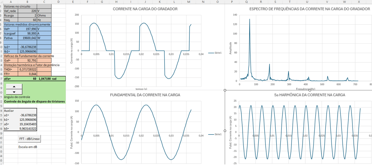 A figura mostra um dasboard utilizando Excel de um sistema de controle do tipo gradador com as formas de onda a corrente na carga, o espectro de frequências da corrente na carga, a fundamental da corrente na carga e a componente de 5a. harmônica gerada no processo de distorção da corrente..