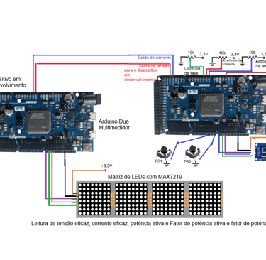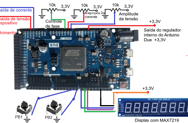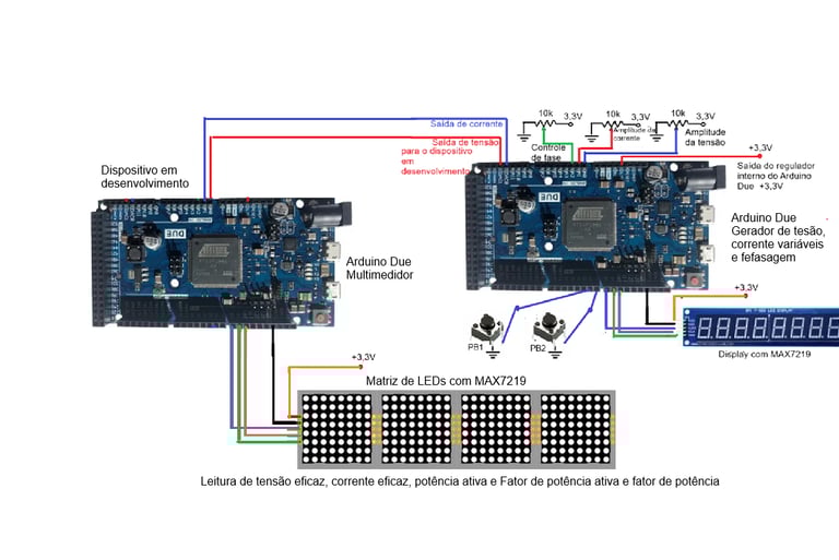 A escolha do processador do Arduino Due deveu-se as capacidades do mesmo com dois DACs de 12 bits (4096 pontos) e perifericamente conversores ADCs de 12 bits, embora para a realização desse intento um ESP32 poderia ser utilizado, porém os DACs do ESP32 são de 8 bits (256 pontos) o que diminuiria a qualidade das ondas senoidais geradas.